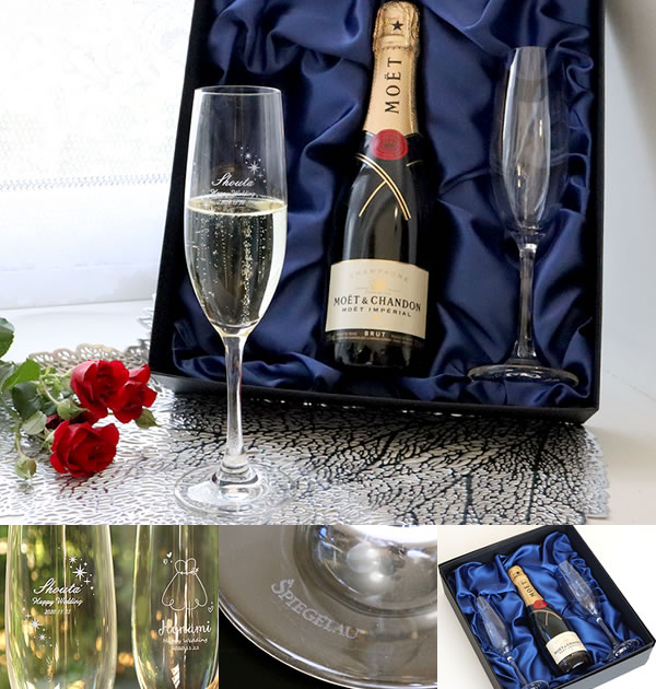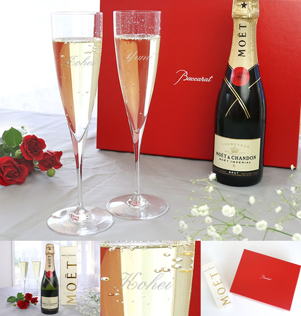 クリスタルの美しさが特徴的なバカラ。上質な輝きが美しいシャンパンフルートペアグラスと一緒にフランス高級シャンパン モエ アンペリアルハーフボトルを。特別なグラスに世界に一つのお名前をお入れして一味違う贈り物に。