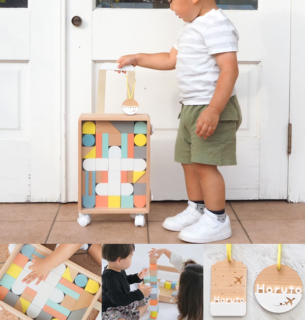 スーツケースの飛行機や積み木のカラーがとっても可愛いコロコロと持ち運べる五感や感性を育むつみきは収納もかわいく、インテリアにも馴染みおしゃれ♪