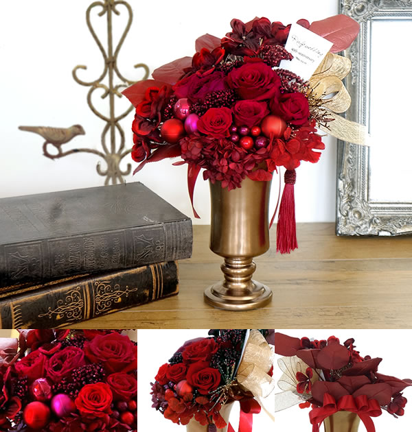 深紅のゴージャスなプリザーブドフラワーアレンジは圧巻の美しさ。真っ赤なお花に情熱的な愛をこめて贈ってみませんか