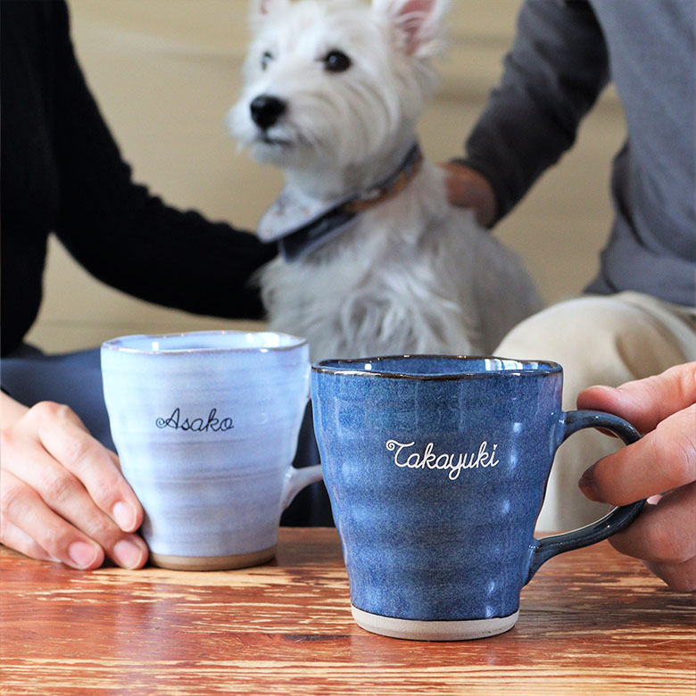 長く人気がある商品ですが、実は藍色に白色の名入れ製作はとても難しく、季節にも左右される商品です。私達も毎日うまくいくように工夫を重ねています。これからも人気のなごみコーヒーマグであって欲しいなぁ!と思います。