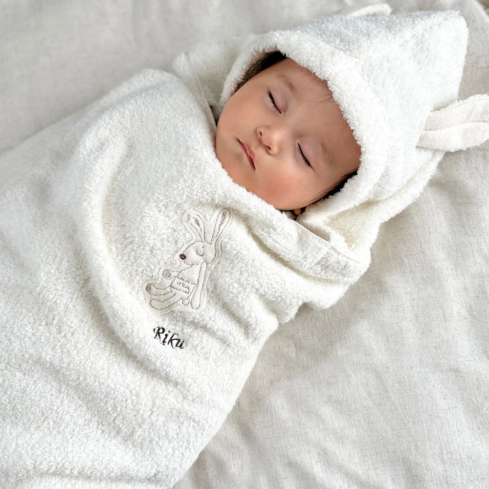 うさぎの耳がかわいいシックな色合いのChoetto(シュエット) アップリケにまでこだわった 赤ちゃんにもママにも安心な素材のフード付きバスタオル(おくるみ)