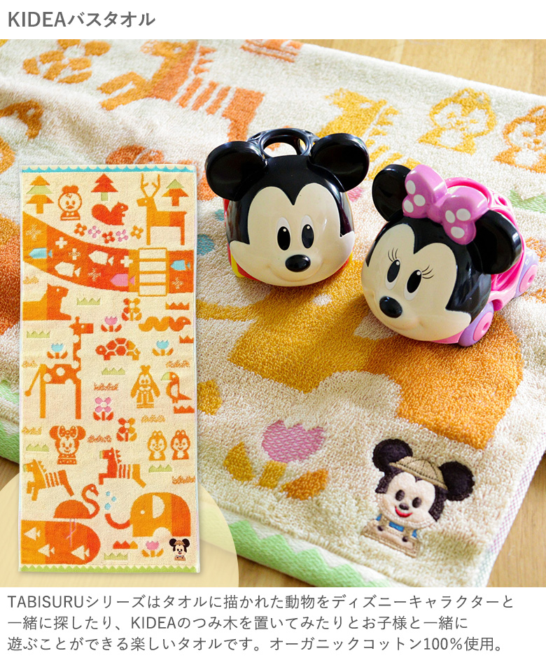TABISURUシリーズはタオルに描かれた動物をディズニーキャラクターと一緒に探したり、KIDEAのつみ木を置いてみたりとお子様と一緒に