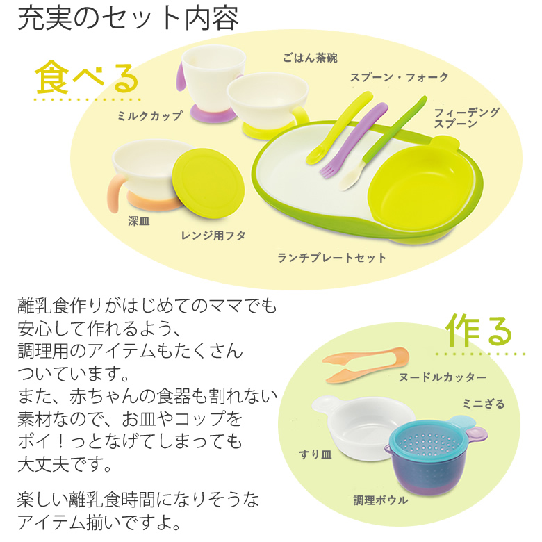 | セット内容 | <離乳食調理器> すり皿・ミニざる・調理ボウル・ヌードルカッター <食器> ランチプレートセット・ご飯茶碗・深皿・ミルクカップ・フィーディングスプーン・スプーン・フォーク・レンジ用フタ 【容量】 すり皿・・・120mL 調理ボウル・・・250mL ご飯茶碗・・・200mL 深皿・・・260mL ミルクカップ・・・210mL |