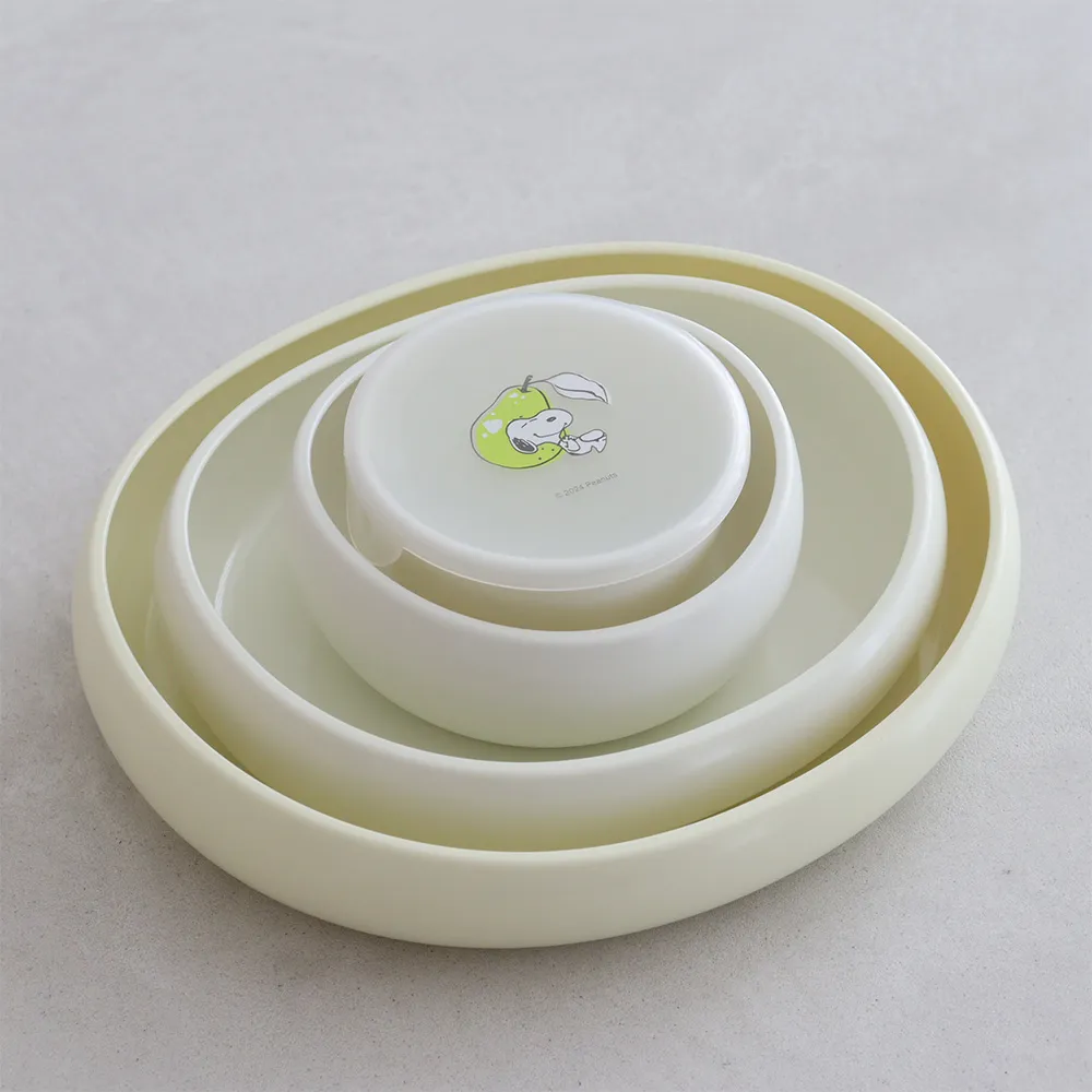 3つのボウルとプレートは、食べ物を集めやすく、こぼさずすくいあげやすい内反りカーブ形状のヘリ付き。