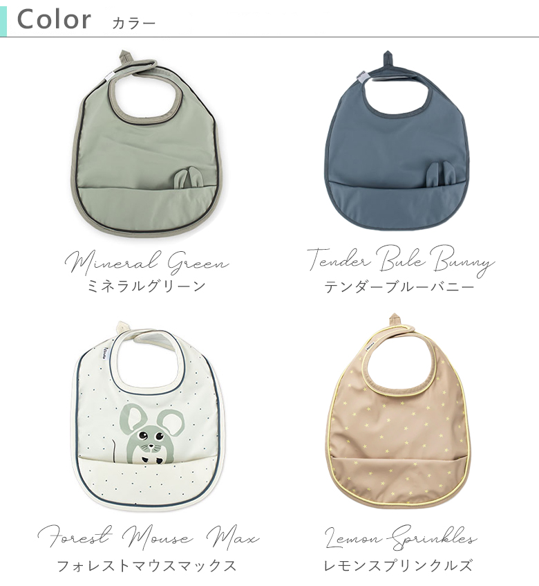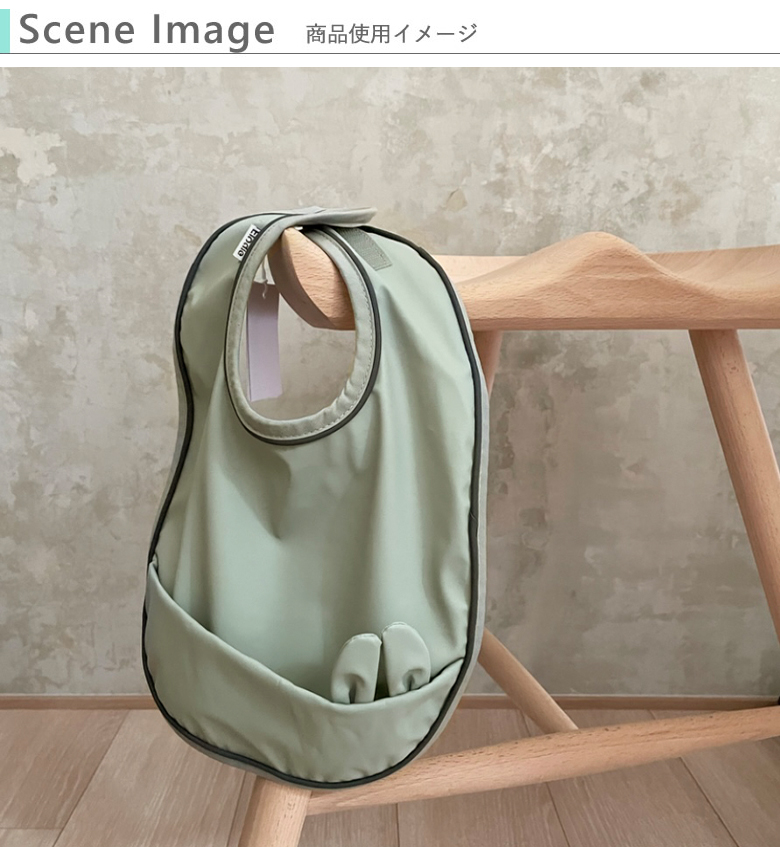 ほどよい厚みのある生地でできたお食事エプロン。撥水加工されており、水分を表面ではじきお洋服にしみ込むのを防ぎます。