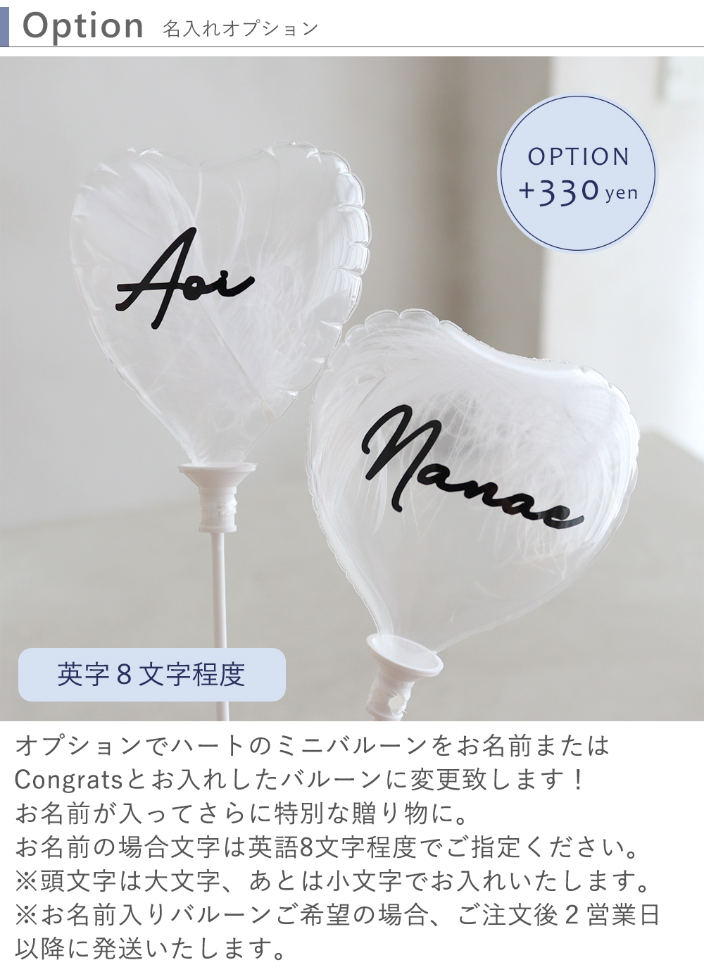+330円でバルーンをつけることができ、バルーンにはお名前をいれることもできます。 英字8文字程度でご指定下さい。 最初の文字は大文字、それ以降は小文字と変換させて頂きます。 ※お名前を日本語でご記入されている場合は、英語に変換させて頂きます。 予めご了承くださいませ。 例:みづき→Mizuki、しょうへい→Shohei |