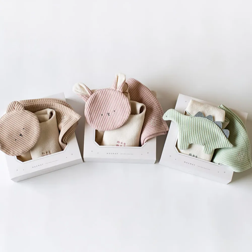 可愛い動物モチーフの汗取りタオル・スタイ・ハンカチをボックスに入れたギフトセットです。