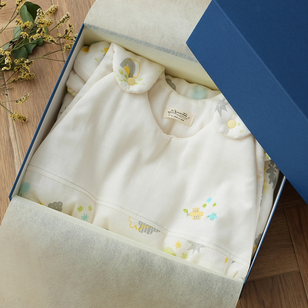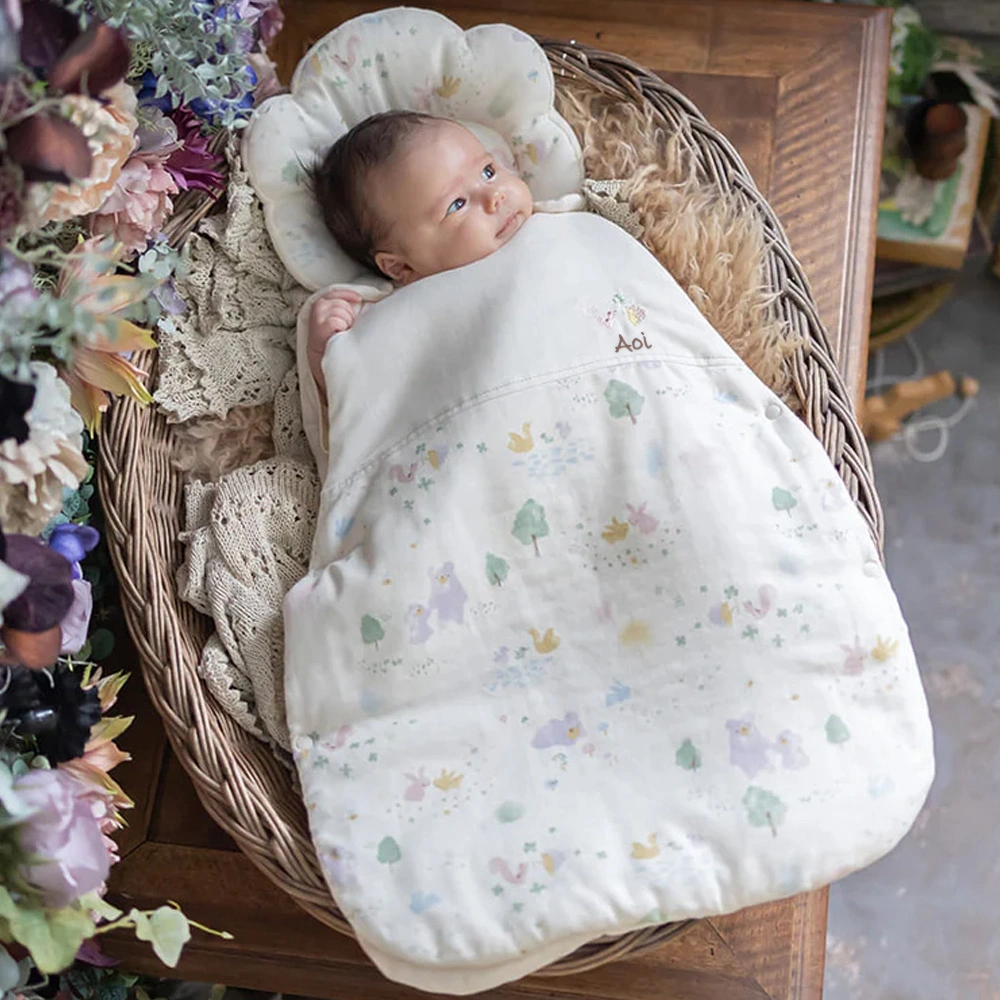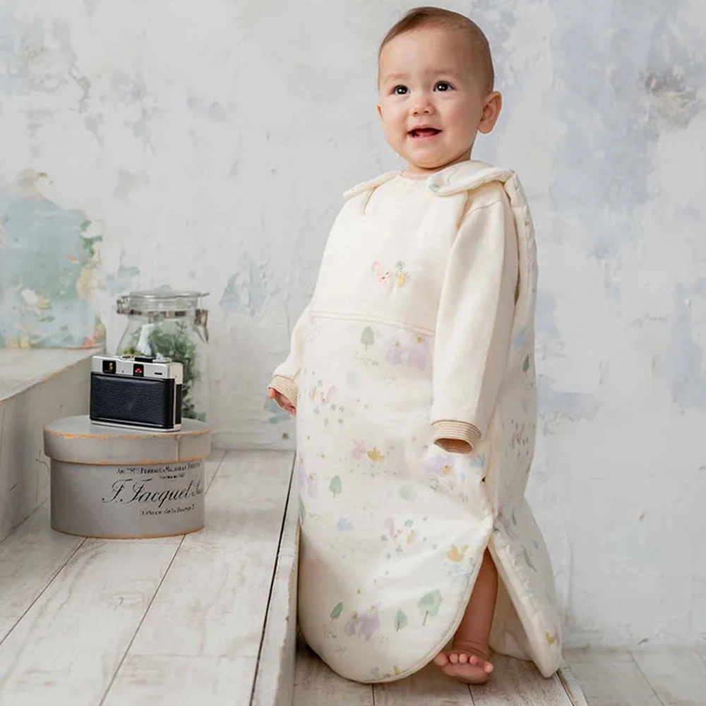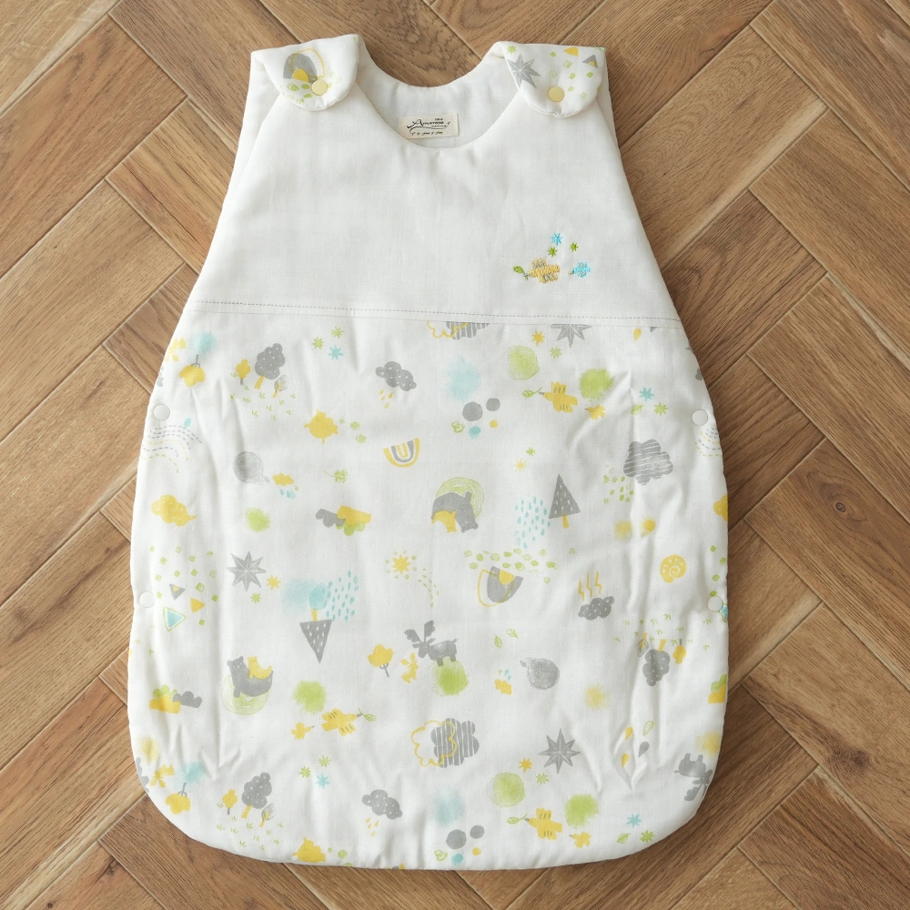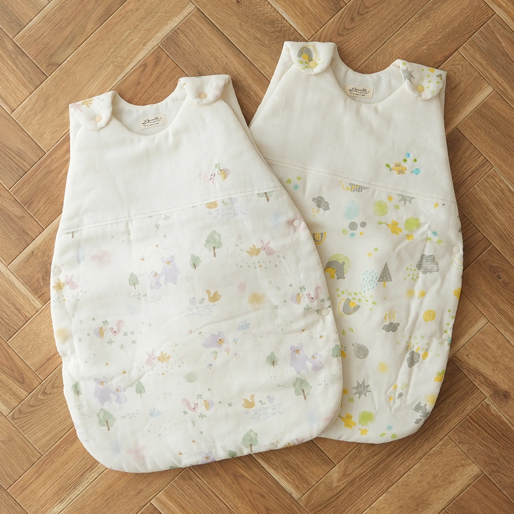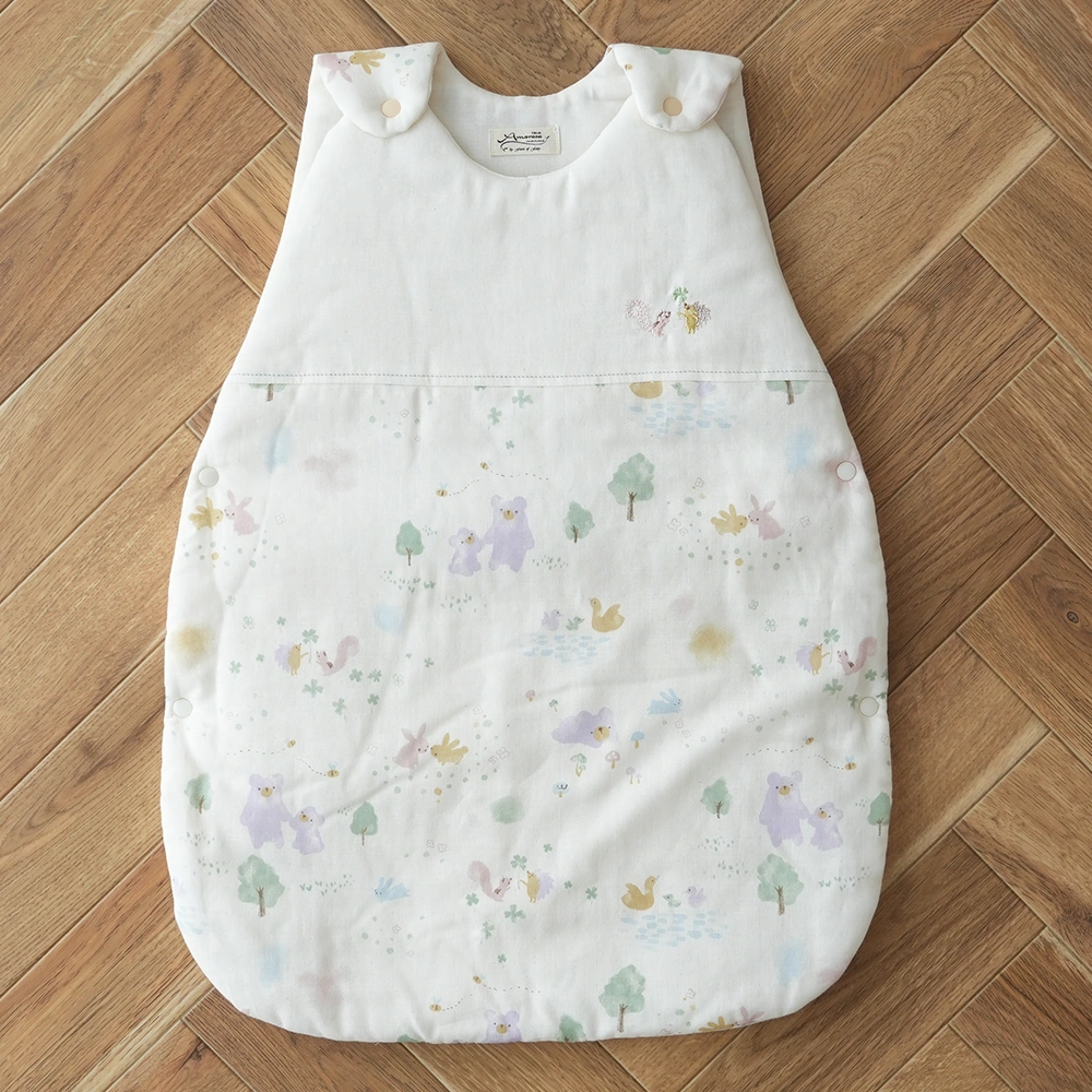 ふんわり水彩タッチで描かれた森や動物たちが、赤ちゃんの眠りをやさしく包み込むスリーパー。