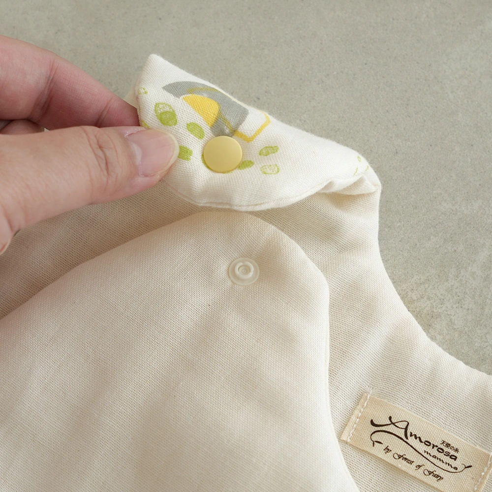 スナップボタンでスムーズに着脱できます。名入れ刺繍ができるので、出産祝いやお誕生日の贈り物にもぴったりです。
