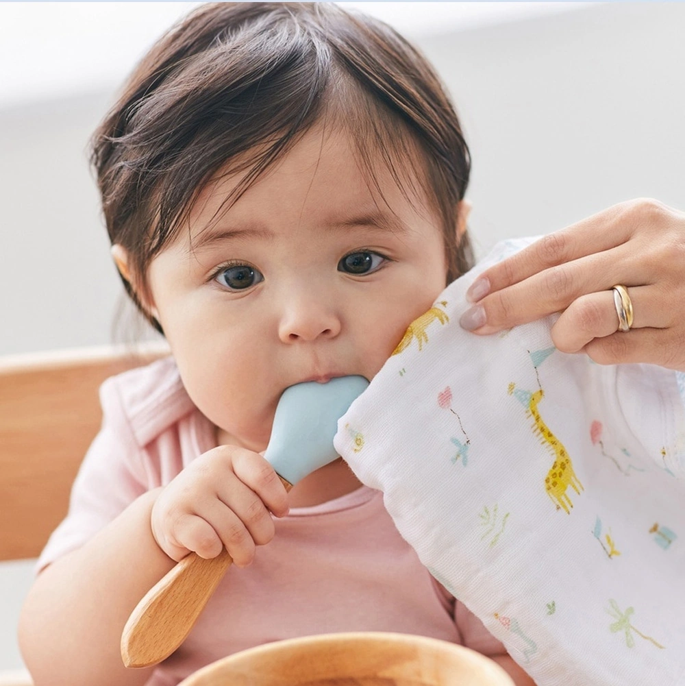 厚みのある3層構造のダブルガーゼ。吸水性が高く、口まわりの汚れや汗もやさしく拭き取ります。
