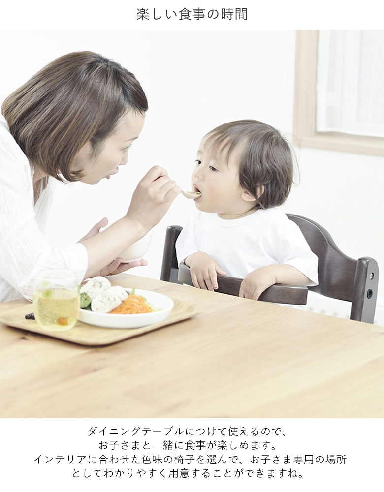 ダイニングテーブルにつけて使えるので、お子さまと一緒に食事が楽しめます。