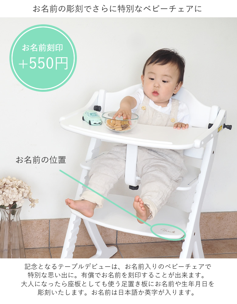 記念となるテーブルデビューは、お名前入りのベビーチェアで