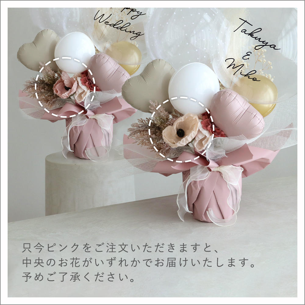 | メッセージについて | 「Happy Birthday」「Happy Wedding」「New Open」など6種類からお選びいただけます。 またはフリーで文字を入れられます。 *フリーテキストは英字10文字程度で入力してください。 *長い場合は2行で製作させていただきます。 *最初の一文字は大文字、あとは小文字でお入れいたします。 |