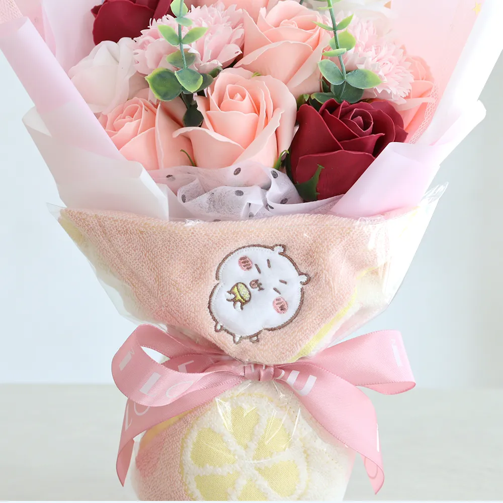 華やかでいい香りのするソープフラワーにちいかわのタオルで可愛らしいブーケに仕上げました。