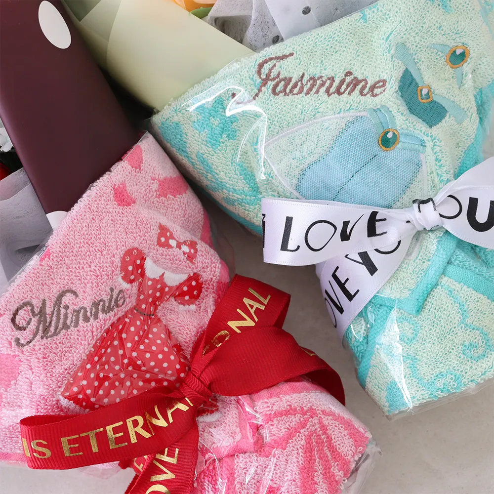 ディズニープリンセスのタオルで可愛らしいブーケに仕上げました。