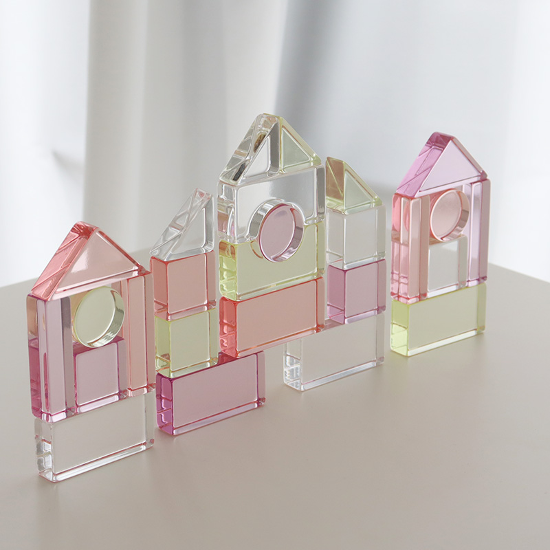 キラキラ光るアクリルの積み木は見た目の可愛さはもちろん、子供達も興味がわいて楽しく遊べます。