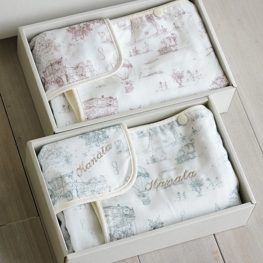 お風呂上がりはもちろん、お昼寝やお出かけのブランケットとしても大活躍。