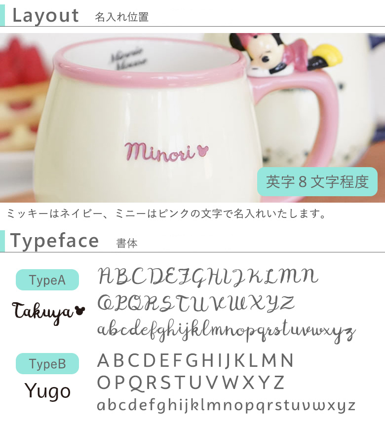 | 名入れ | ・刻印できる文字数にご注意下さい 英字8文字程度。 ・ミッキーはネイビー、ミニーはピンクで名入れ致します。 ・Type1、Type2からお選びください。 ・お申し込みいただいた名入れのアルファベット文字を 大文字から小文字、または小文字から大文字に変更させていただくことがあります。 予めご了承下さい。 |