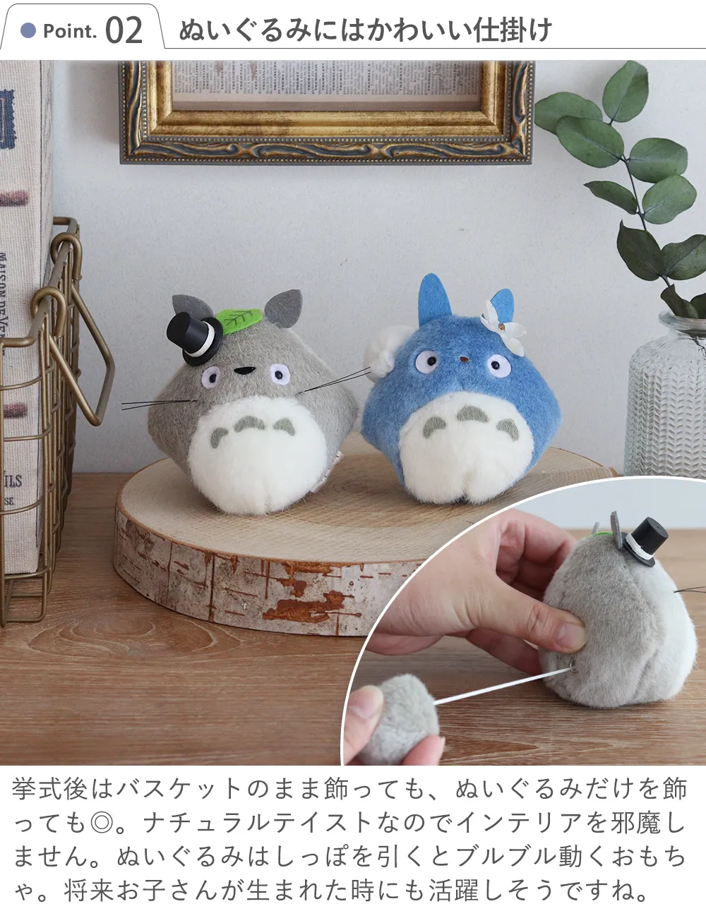 ・大トトロ 約100mm 素材 本体:ポリエステル ・中トトロ 約85mm 素材 本体:ポリエステル ・カゴ約 W250×D100×H230mm 電報カード:W150×H108mm(畳んだ状態) |