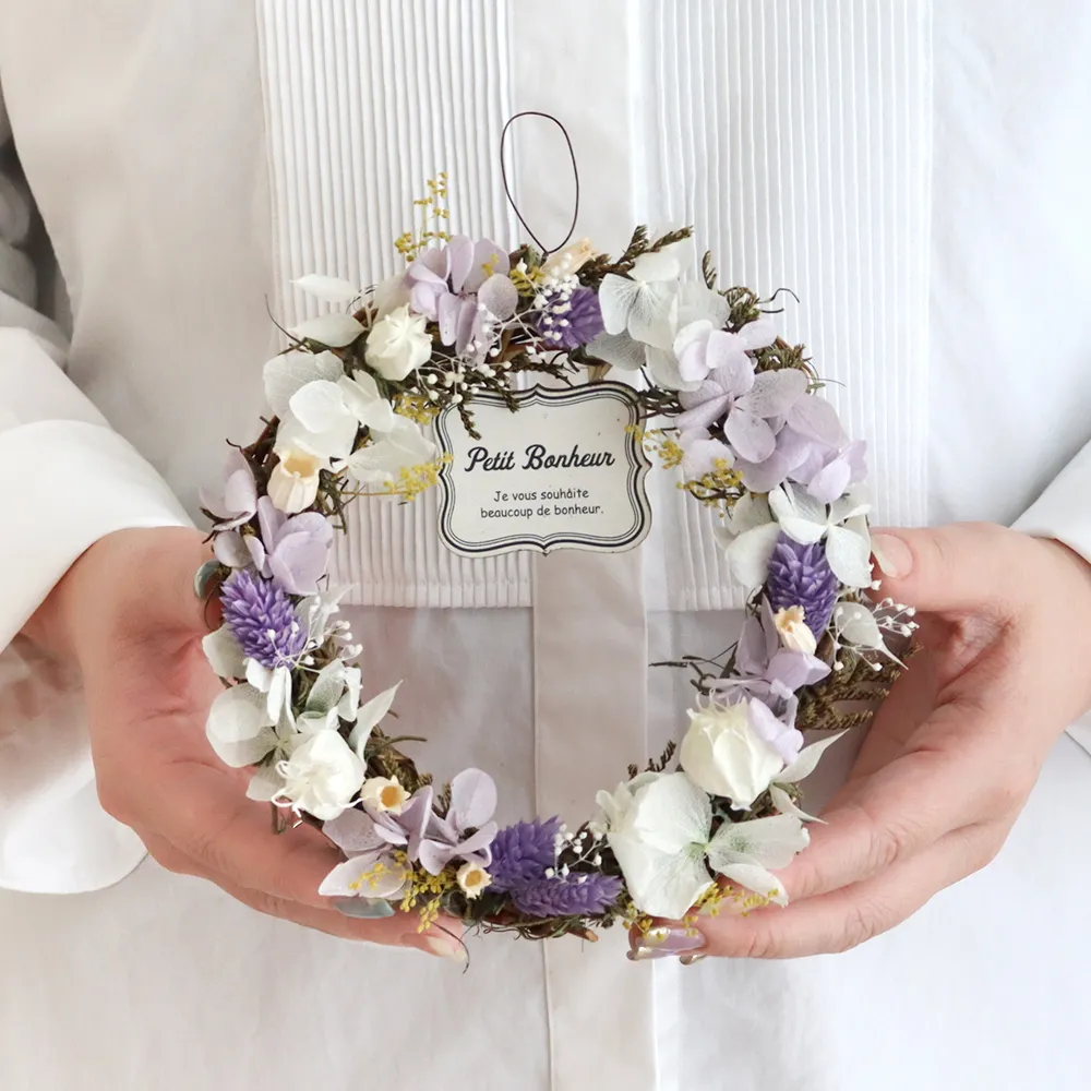 水やりやお手入れが不要なプリザーブドフラワーとドライフラワーを使用したフラワーリースは、