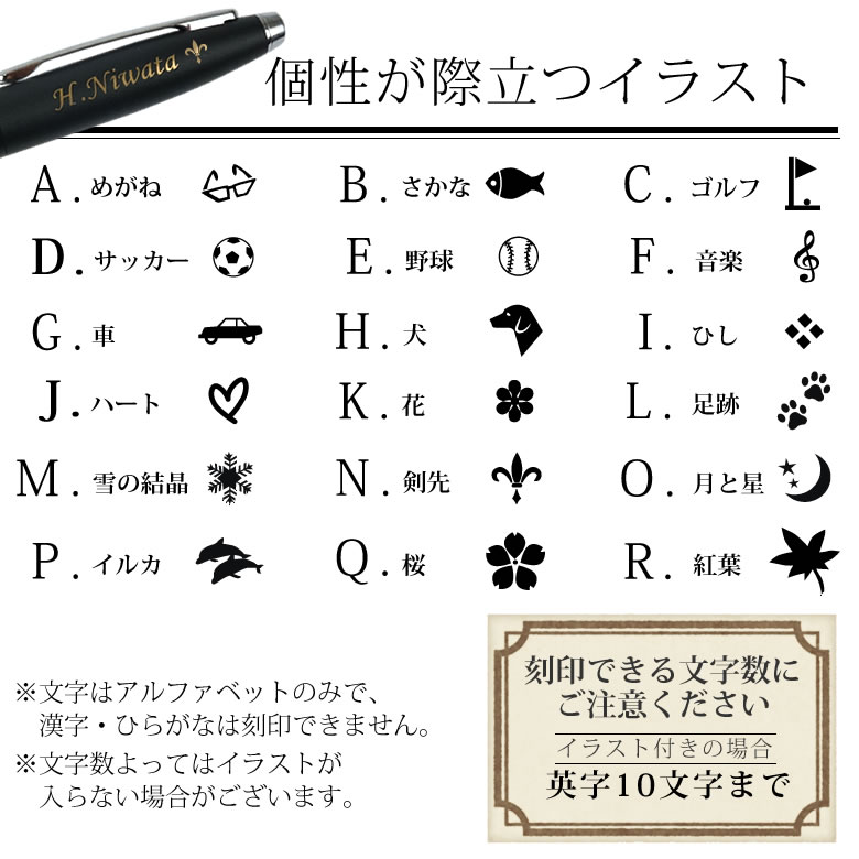 刻印できる文字数は、名前のみ英字11文字まで、名前+イラスト…英字10文字までとなります。 ※姓と名前のあいだにある『・』『,』『-』は 『 . 』に変更させていただきます。 ※書体によってお申し込みいただいた名入れ文字を大文字から小文字、または小文字から大文字に変更させていただくことがあります。予めご了承下さい。 |