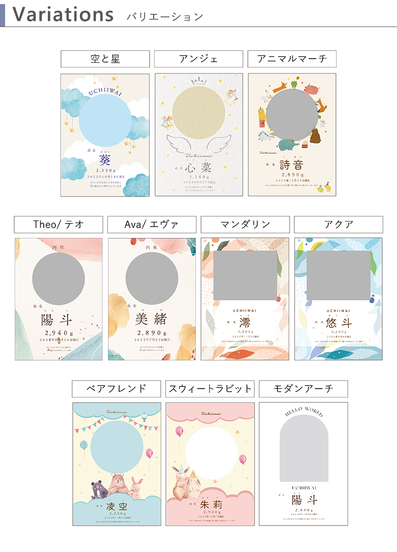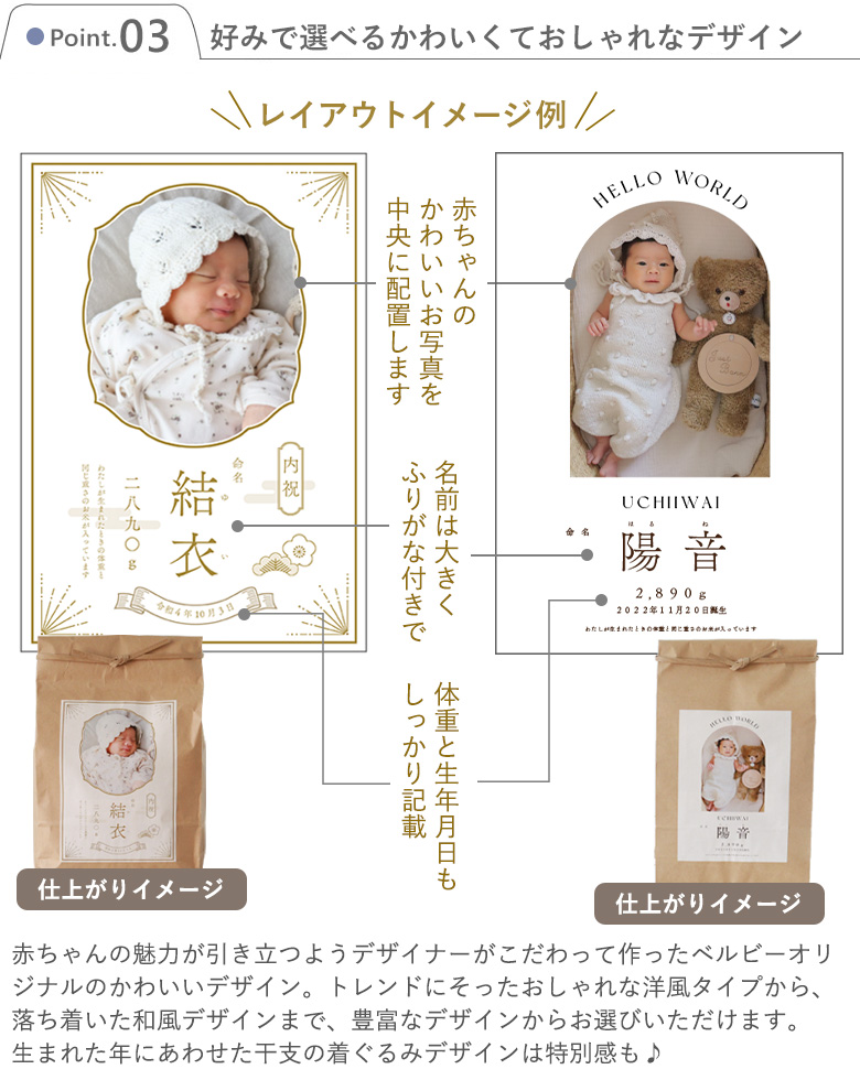 赤ちゃんの魅力が引き立つようデザイナーがこだわって作ったベルビーオリジナルのかわいいデザイン。 トレンドにそったおしゃれな洋風タイプから、落ち着いた和風デザインまで、豊富なデザインからお選びいただけます。