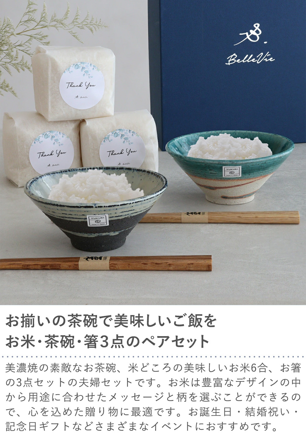 お揃いの茶碗で美味しいご飯を お米・茶碗・箸3点のペアセット