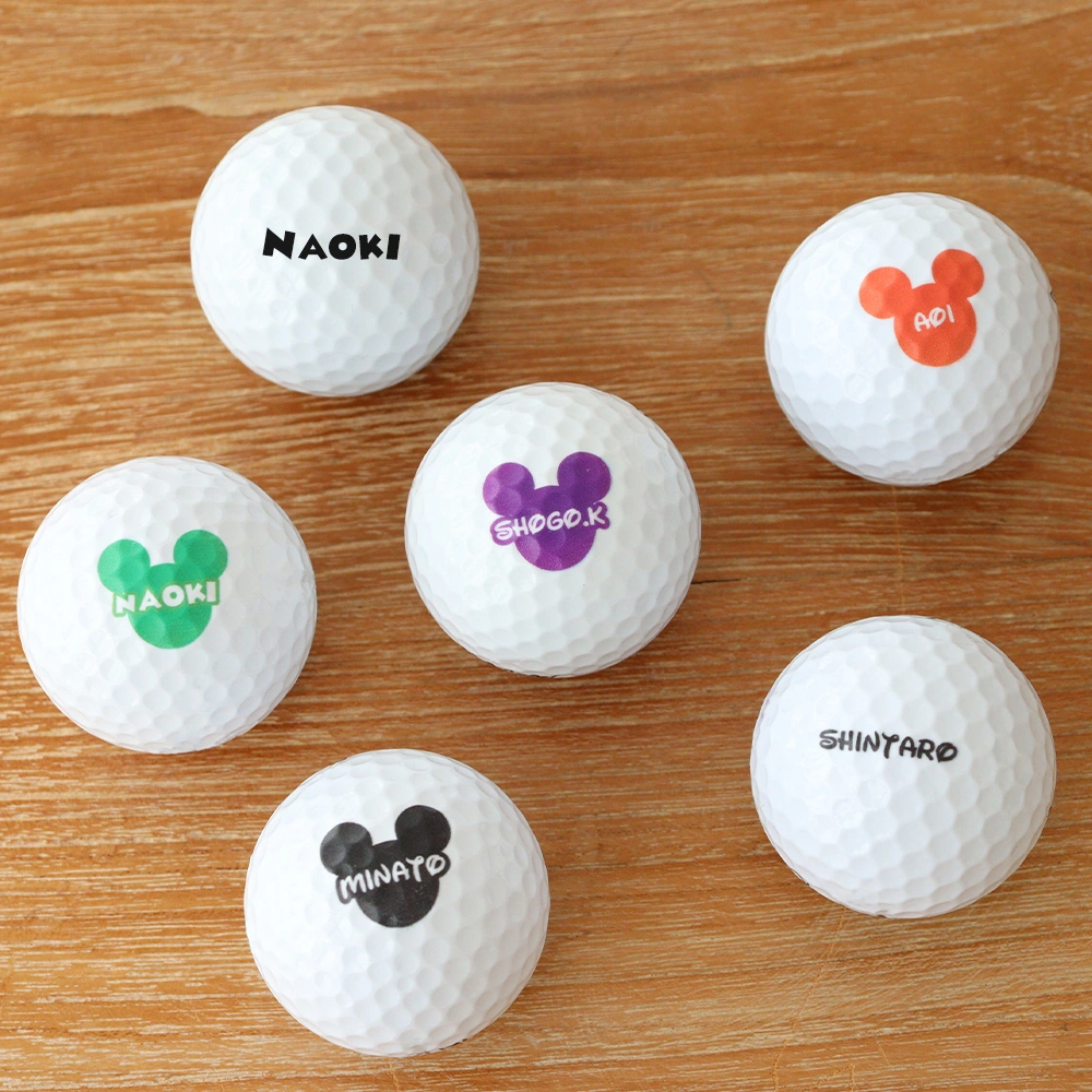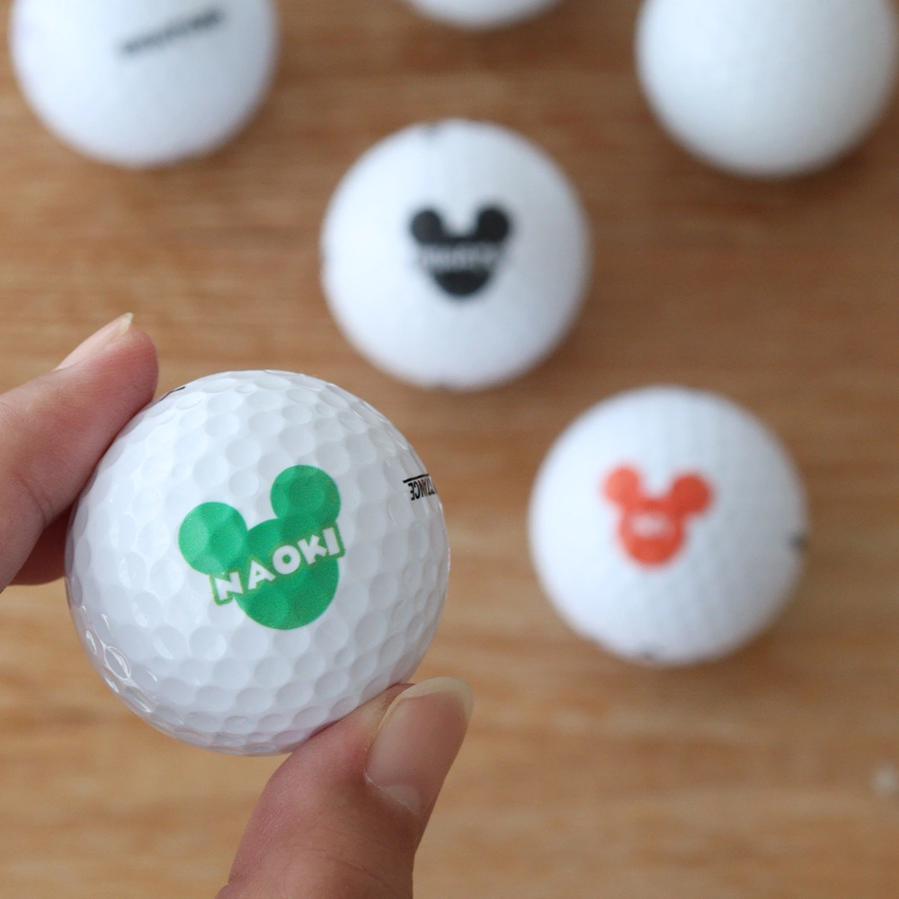 ミッキーのシルエットや、遊び心のあるフォントでお名前を入れたゴルフボール。