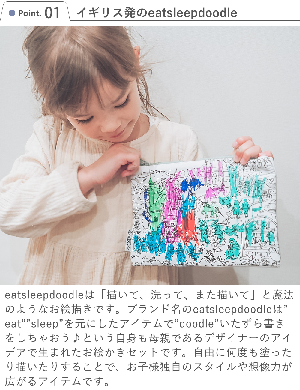 Eatsleepdoodleは洗濯すれば何度でも使うことができるイギリス発のお絵描き・塗り絵セット。