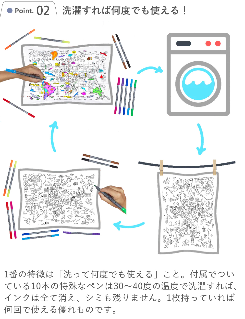 付属でついている10本の特殊なペンは30~40度の温度で洗濯すれば、インクは全て消え、シミも残りません。