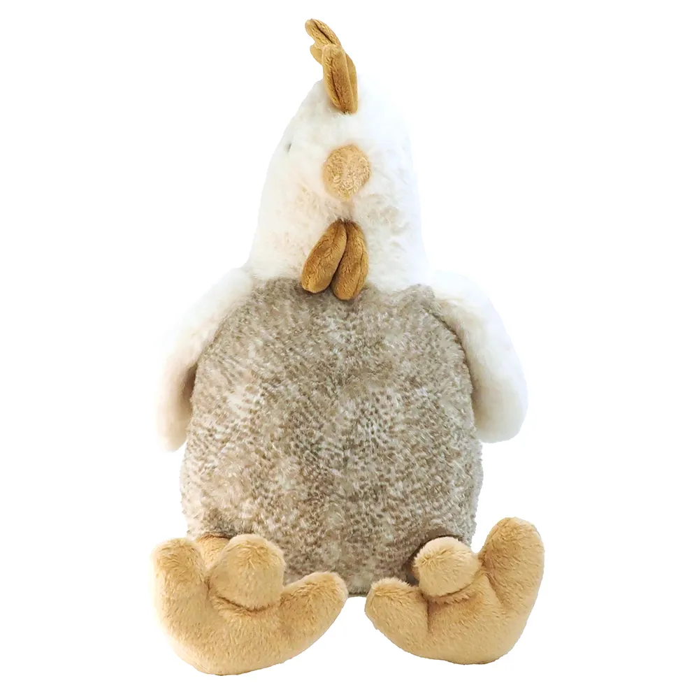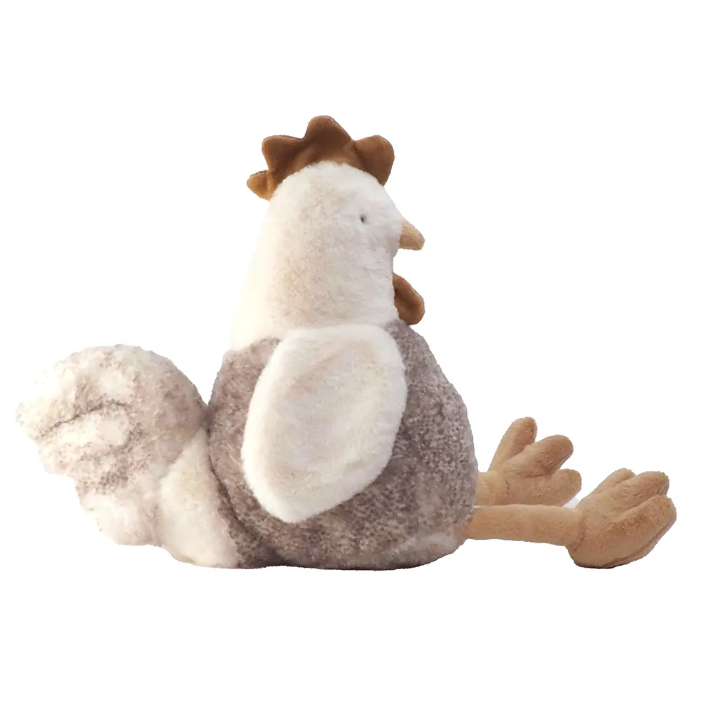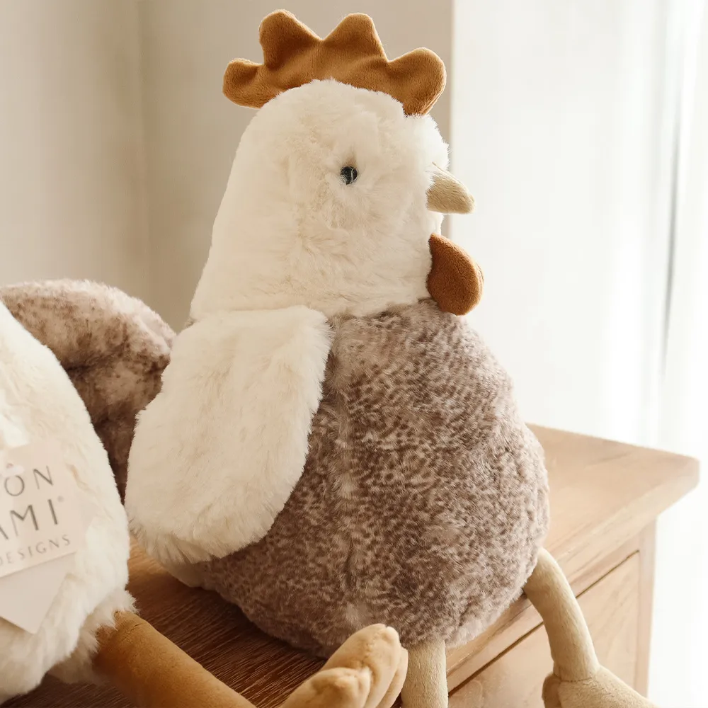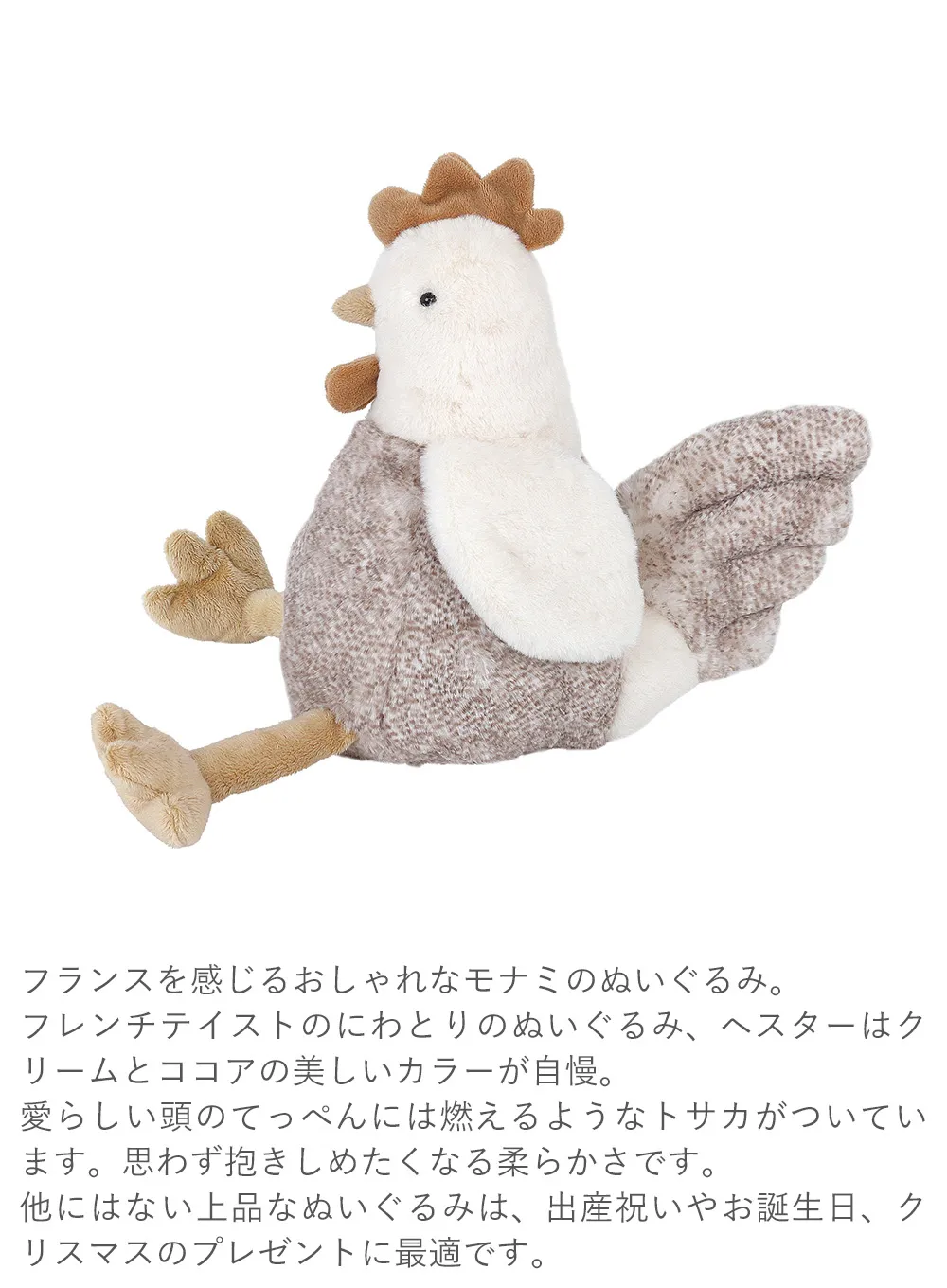 フレンチテイストのにわとりのぬいぐるみ、ヘスターはクリームとココアの美しいカラーが自慢。