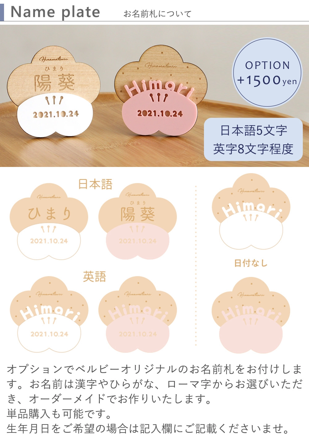 オプションでベルビーオリジナルのお名前札をお付けします。 立札に施すお名前は漢字やひらがな、ローマ字からお選びいただき、オーダーメイドでお作りいたします。 単品購入も可能ですので、姉妹のお名前を並べたり妹が生まれたときに追加購入ができたりするのも安心です。 生年月日をご希望の場合は記入欄にご記載くださいませ。 |