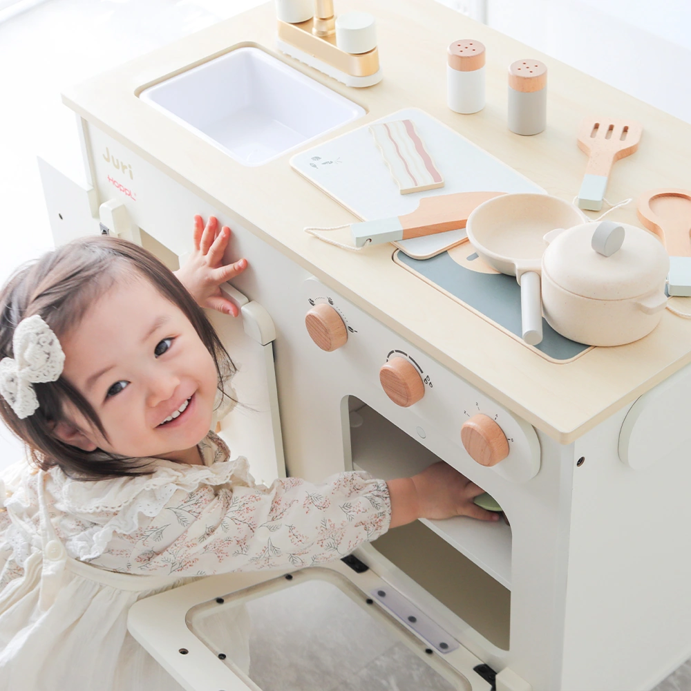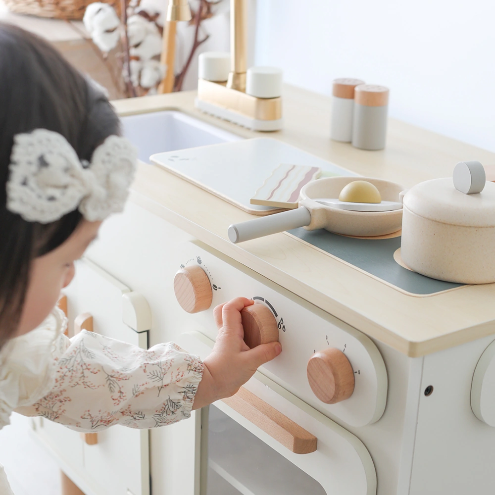 お子さまの成長に長く寄り添うおままごとキッチンは、A4サイズもすっぽり入る大きさ。