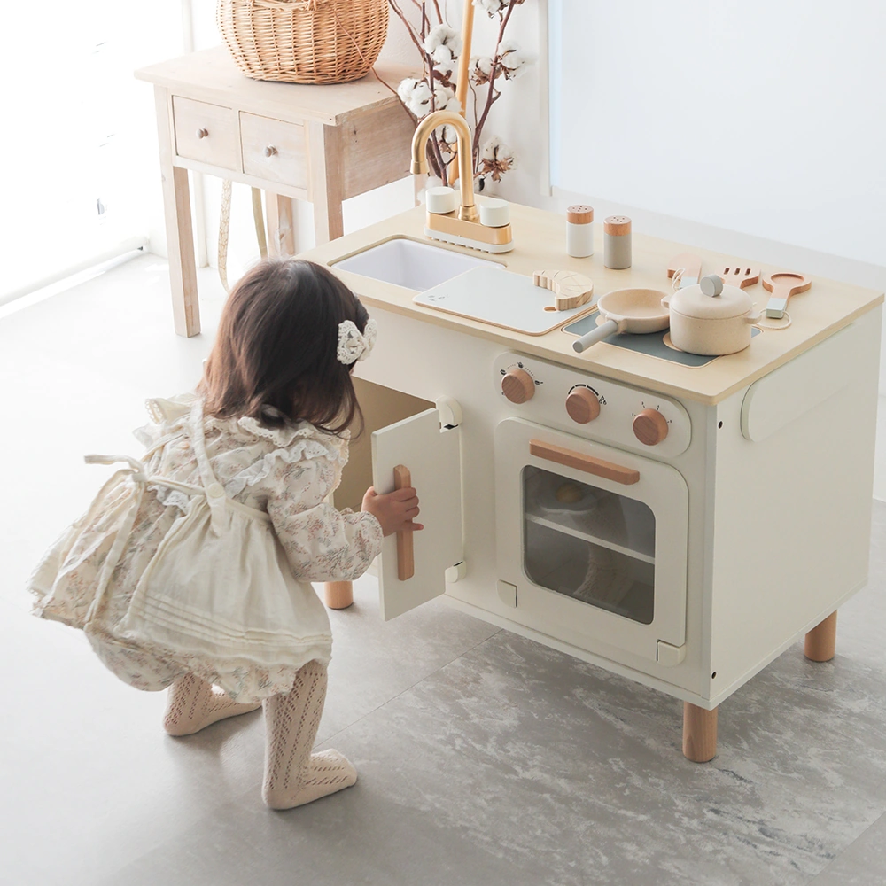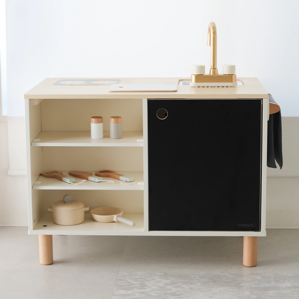 コンロやシンクでのおままごとから、背面の黒板を使ったお店屋さんごっこまで、遊びの幅がぐんと広がるリバーシブルキッチン。
