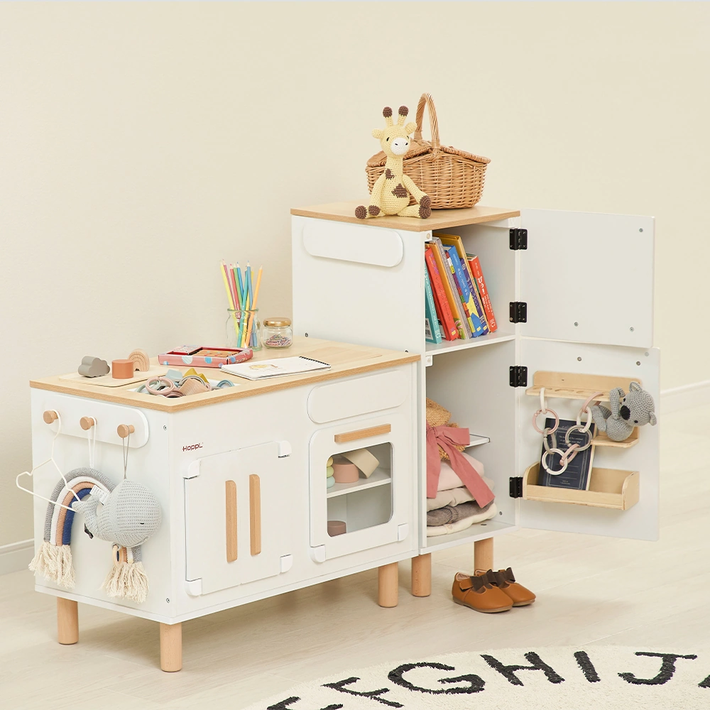 成長に合わせておもちゃから収納家具としても活躍し、お部屋に馴染む落ち着いたカラーがインテリアをおしゃれに演出します。