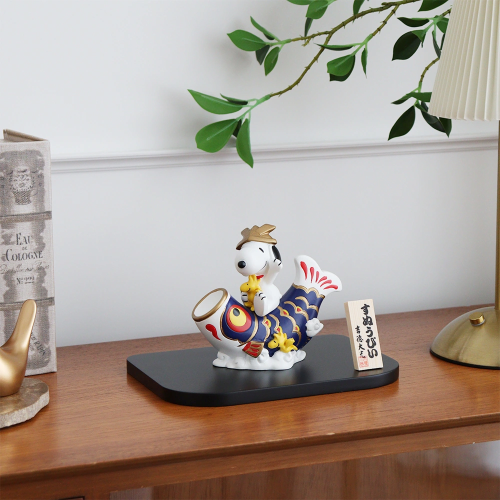 スヌーピーとウッドストックが、勢いよく泳ぐ鯉に乗った元気いっぱいの五月人形。
