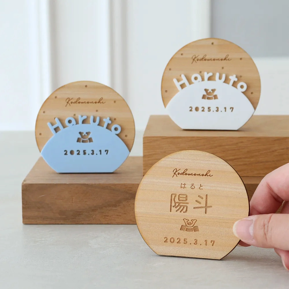 お子さまのお名前や生年月日を入れられる木製札をオプションでご用意。
