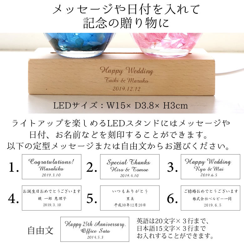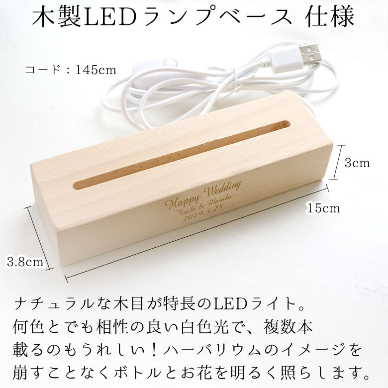 | メッセージ入りLEDスタンドボックス ¥4,480 | フロストガラスを通して幻想的な表情のメッセージ入りLEDスタンド。複数本のハーバリウムを同時にライトアップを楽しめます! サイズ:本体:約W25.3×D9.8×H3.5cm(USBケーブル約0.9m) BOXサイズ:約W11.6×D4.2×H31.5cm 電源:・USBケーブル・USBコンセントが付属します。 連続点灯時間:約24時間(お使いの電池の種類により異なります) ※注意:木目は天然素材ですので、個体差があります。多少の削れ・ヒビ・ざらつきが生じている場合がございます。 ご了承ください。 ※こちらのページにてご購入いただけます。