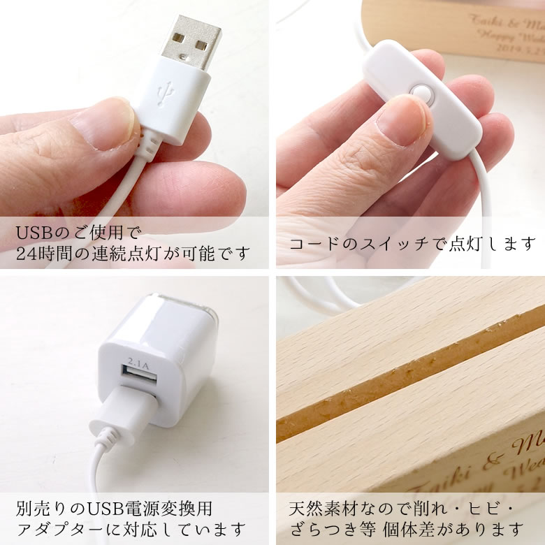 | メッセージ入り木製LEDランプベース ¥3,480 | ナチュラルな木目が特長のメッセージ入りLEDライト。 サイズ:縦3.8x横15x高さ3cm(ケーブル:145cm) 素材:木 電源:USB(コンセントへのプラグは別途ご用意ください。) 連続点灯時間:約24時間(お使いの電池の種類により異なります) 光り方:単色(白色)点灯 ※注意:木目は天然素材ですので、個体差があります。多少の削れ・ヒビ・ざらつきが生じている場合がございます。 ご了承ください。 ※こちらのページにてご購入いただけます。