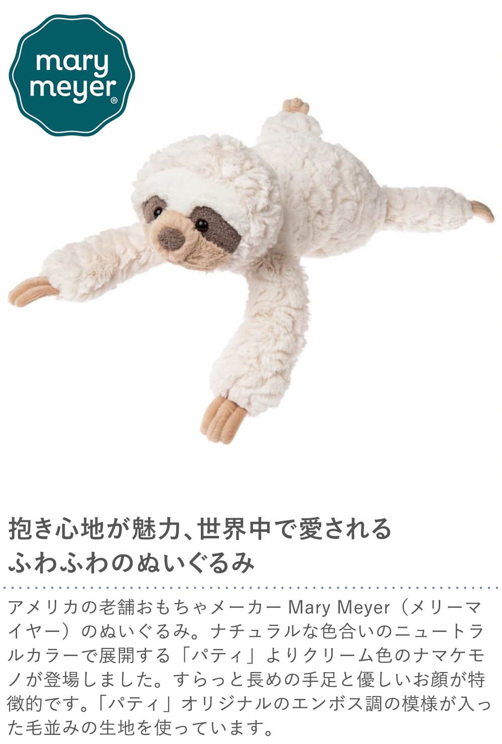 ナチュラルな色合いのニュートラルカラーで展開する「パティ」よりクリーム色のナマケモノが登場しました。