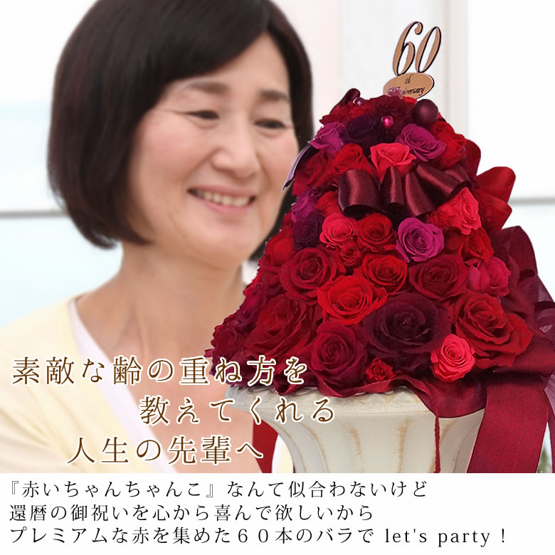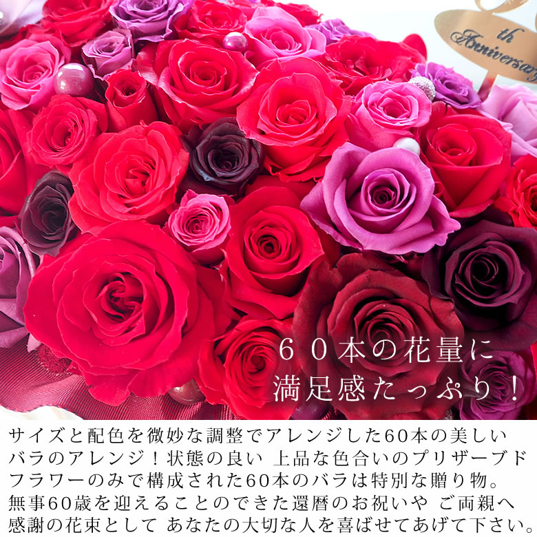 人生の節目に 記念の数のバラで祝福!『還暦』と言われてもまだまだ若く美しいあの方へ贈るラグジュアリーで美しい60本の真っ赤なプリザーブドフラワーのスペシャルなアレンジ。