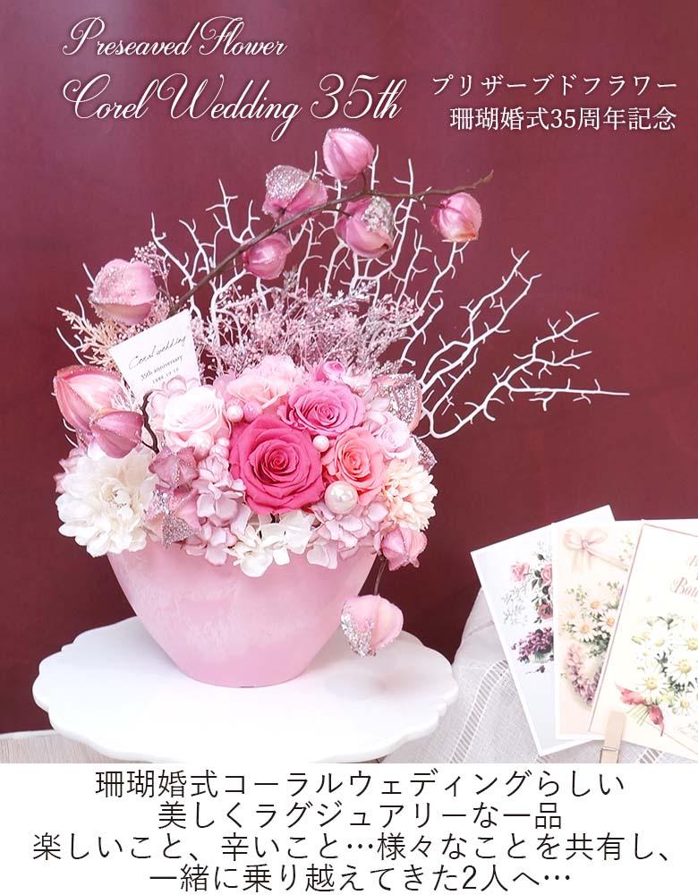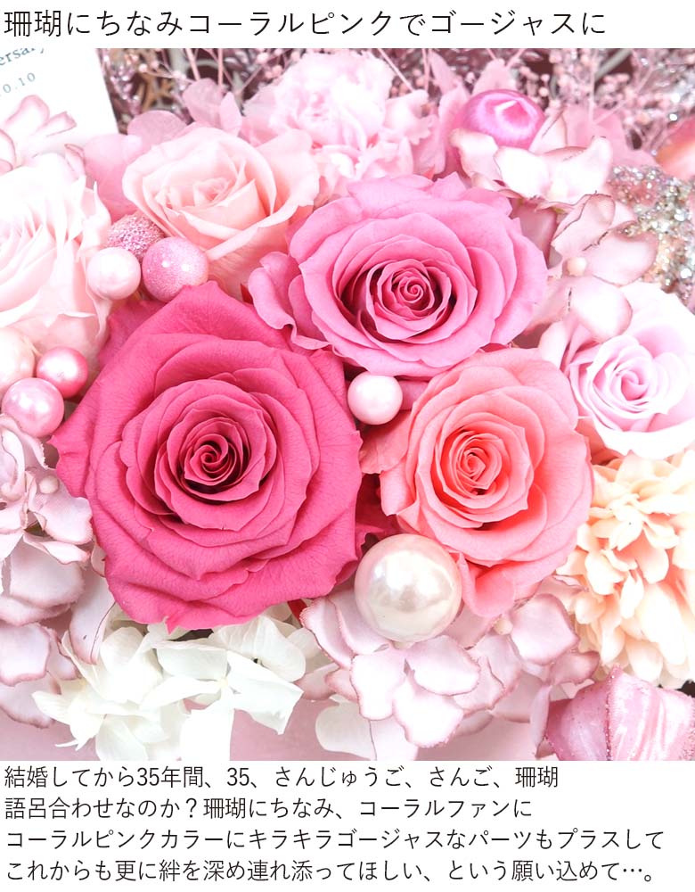 結婚してから35年間。珊瑚にちなんでコーラルピンクカラーアレンジ。これからも更に絆を深め連れ添ってほしい、という願い込めて。クリアケース付♪