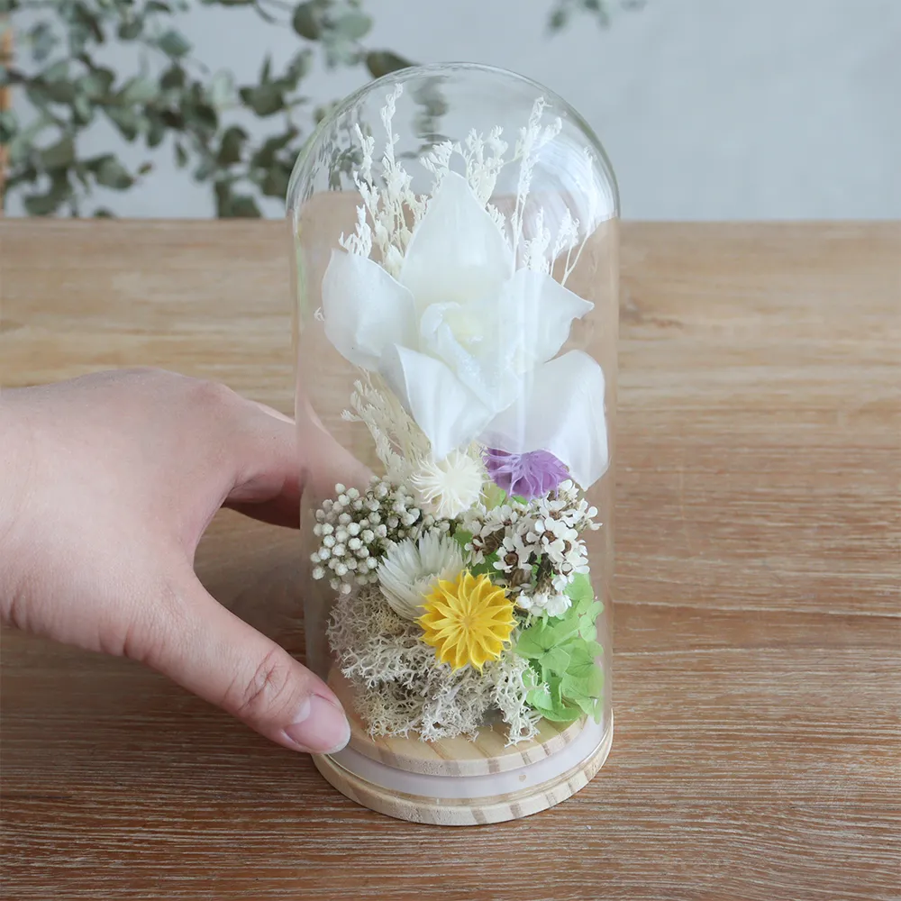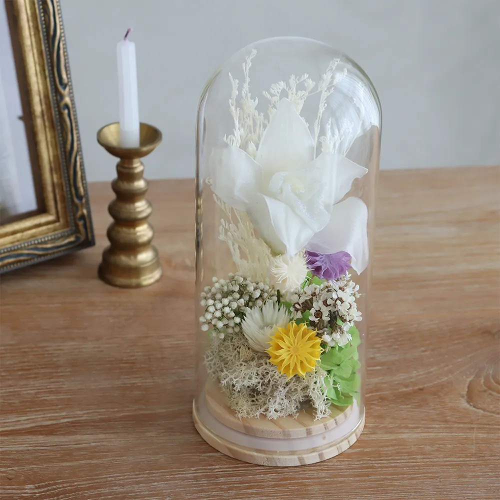 | SPEC | SIZE:約Φ80×H190mm BOX:W90×D90×H220mm 主な商材:プリザーブドフラワー(シンビジューム、アジサイ、他)/ ドライフラワー(シルバーデイジー、カップフラワー、デイジー、カスピア、他)/ガラスドーム・土台、など。 |