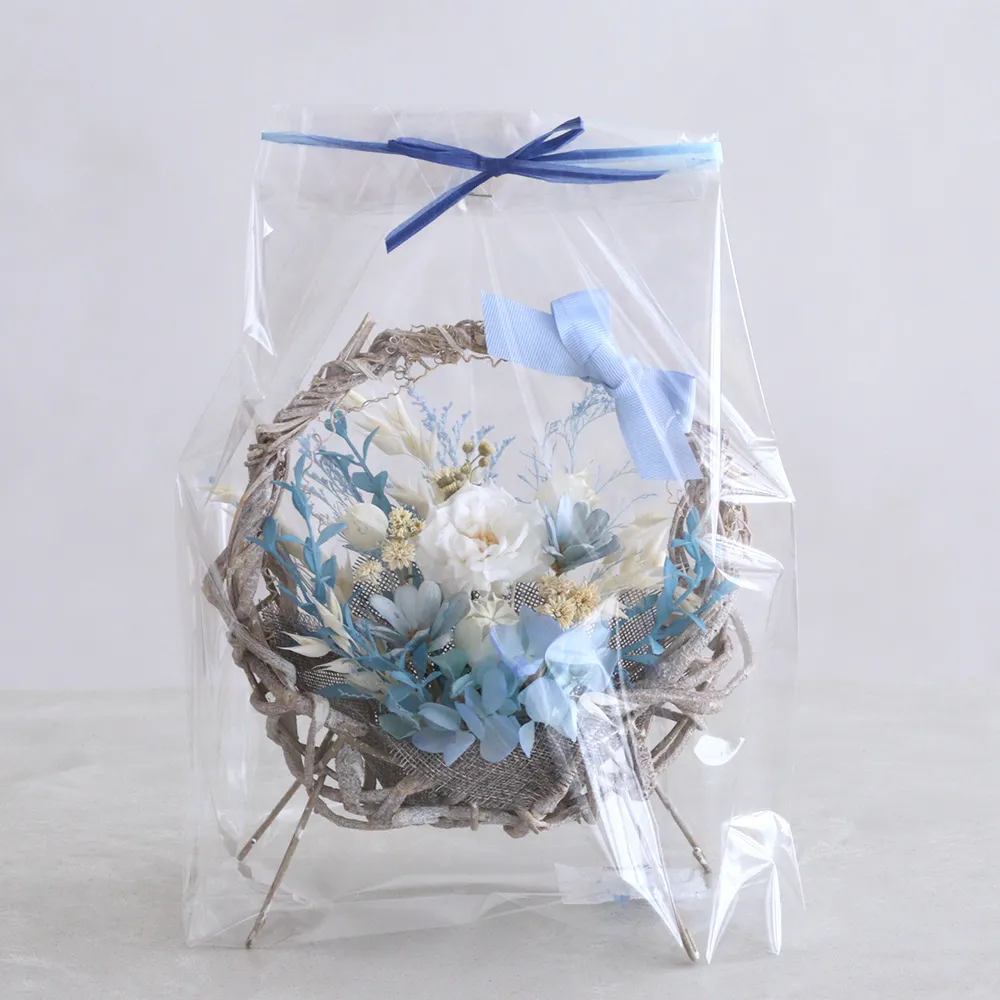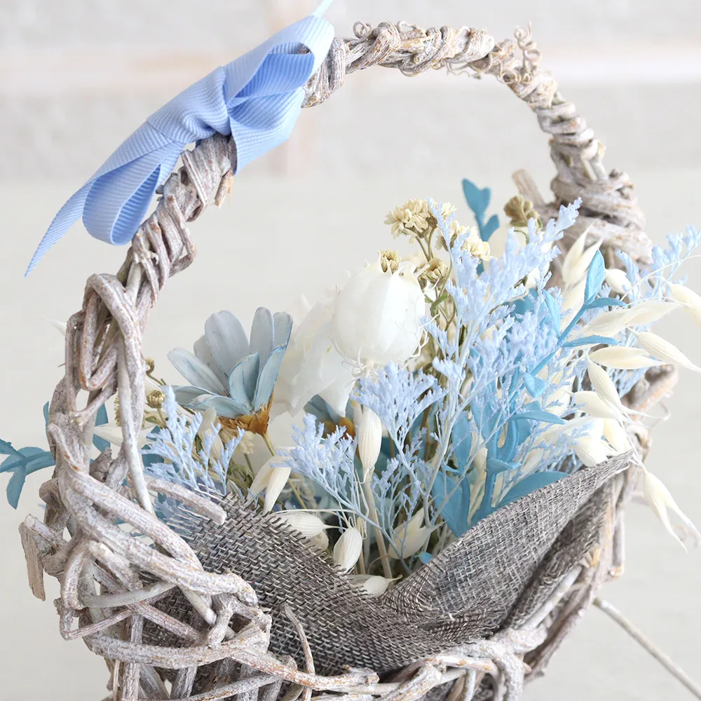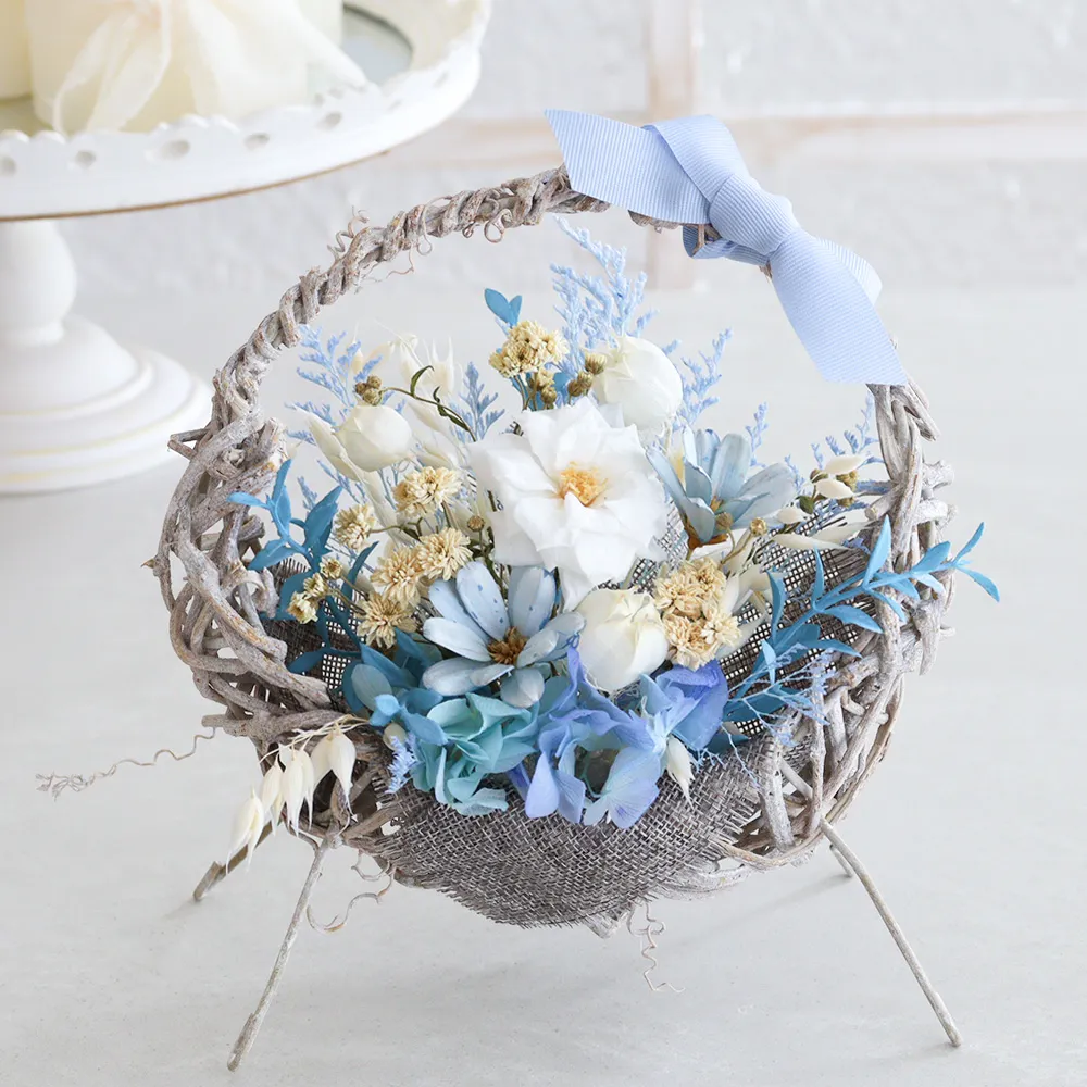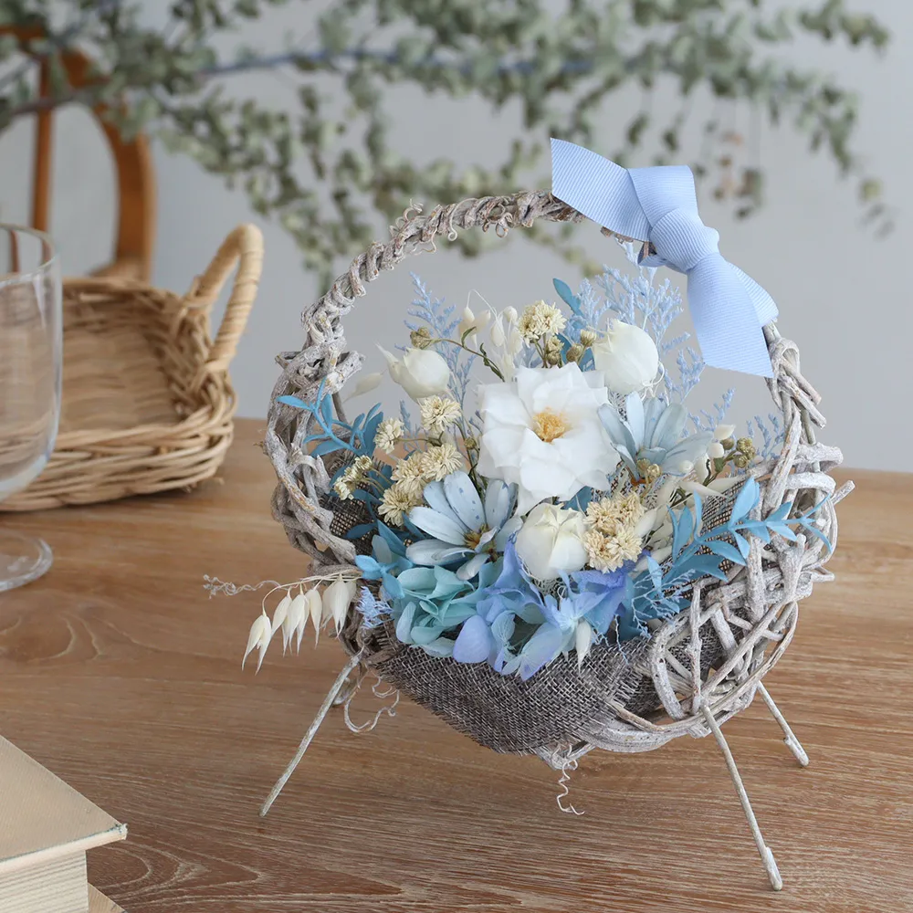 ナチュラルなカゴに、涼しげなカラーでアレンジされて ちょっとした贈り物にぴったり