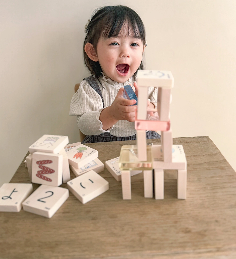 昔ながらの知育玩具にアクリルのきらめきを添えた、新しいひらがな積み木。大人もこどもも心ときめく絵柄で、お名前を並べたり、言葉を楽しんだり“かわいい”と“知育”を兼ね備えた積み木です。安心して遊べる国産の木を使用。